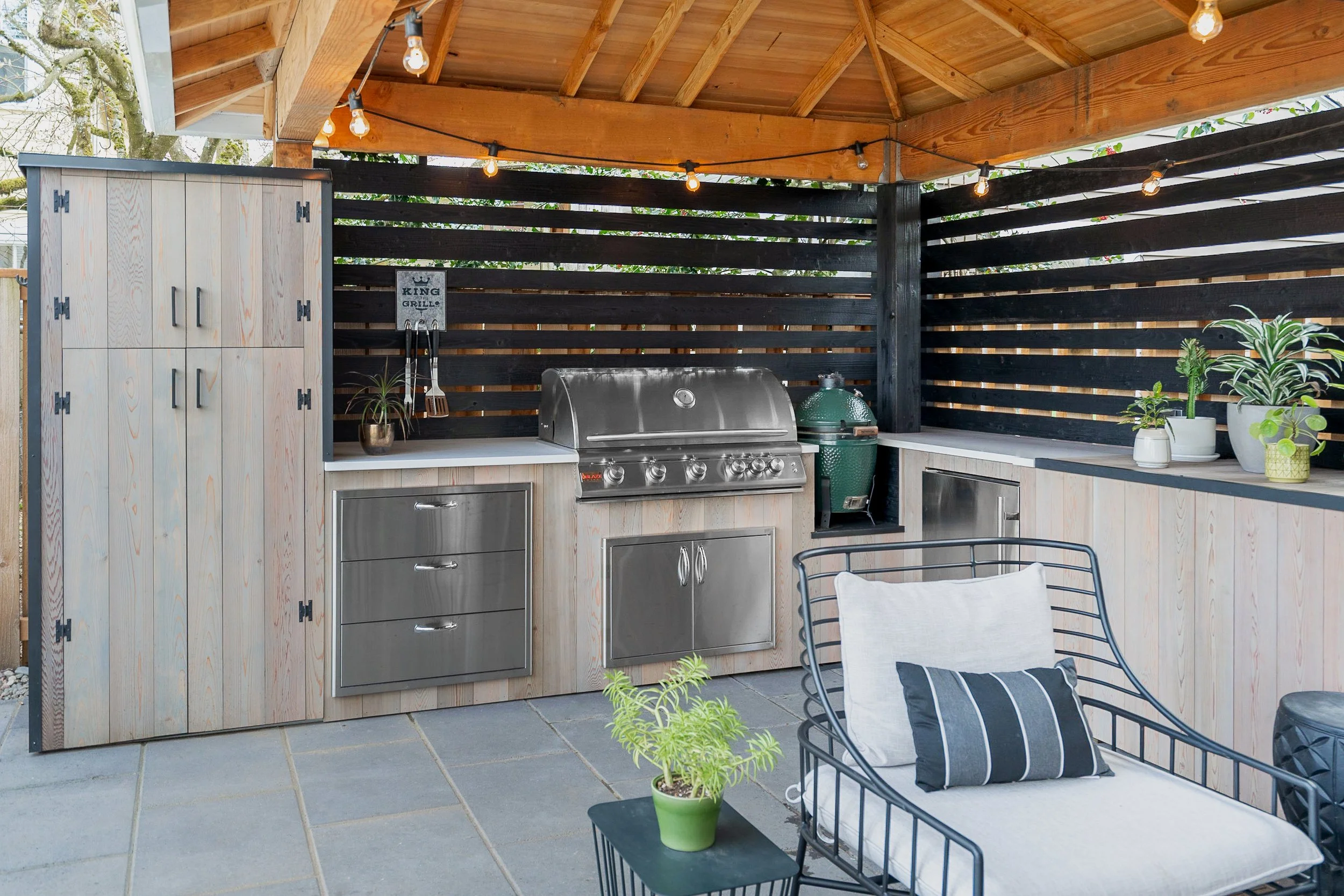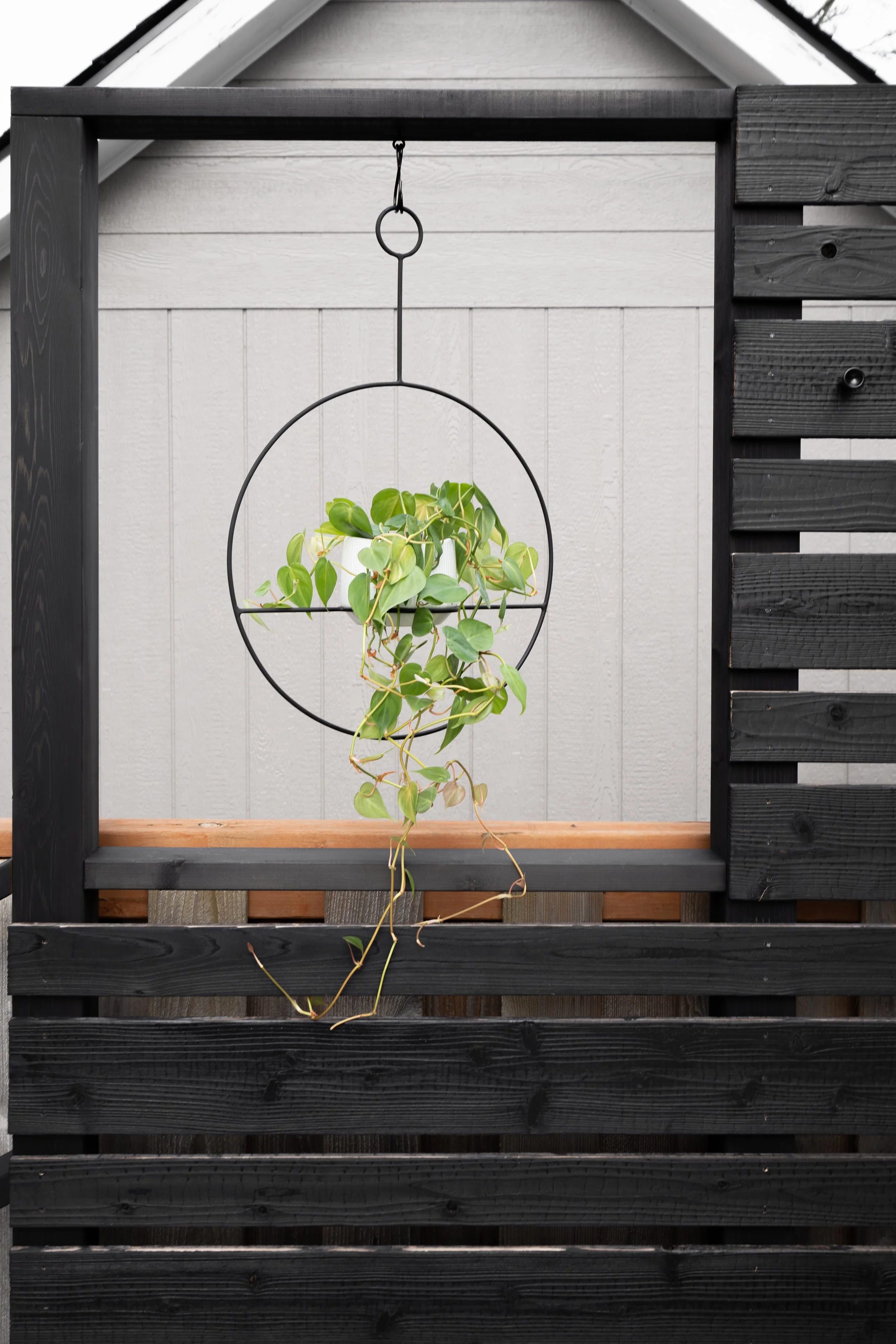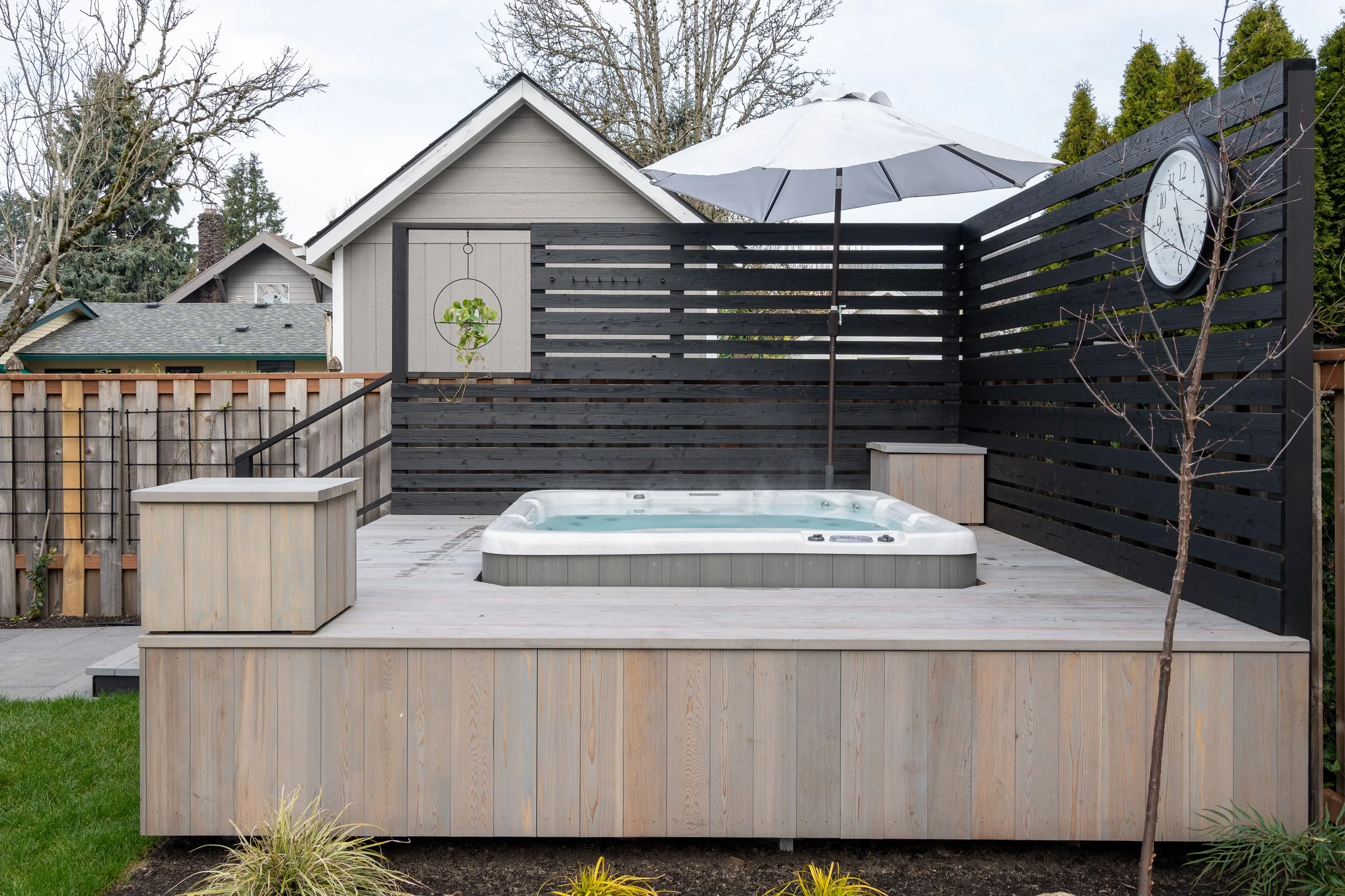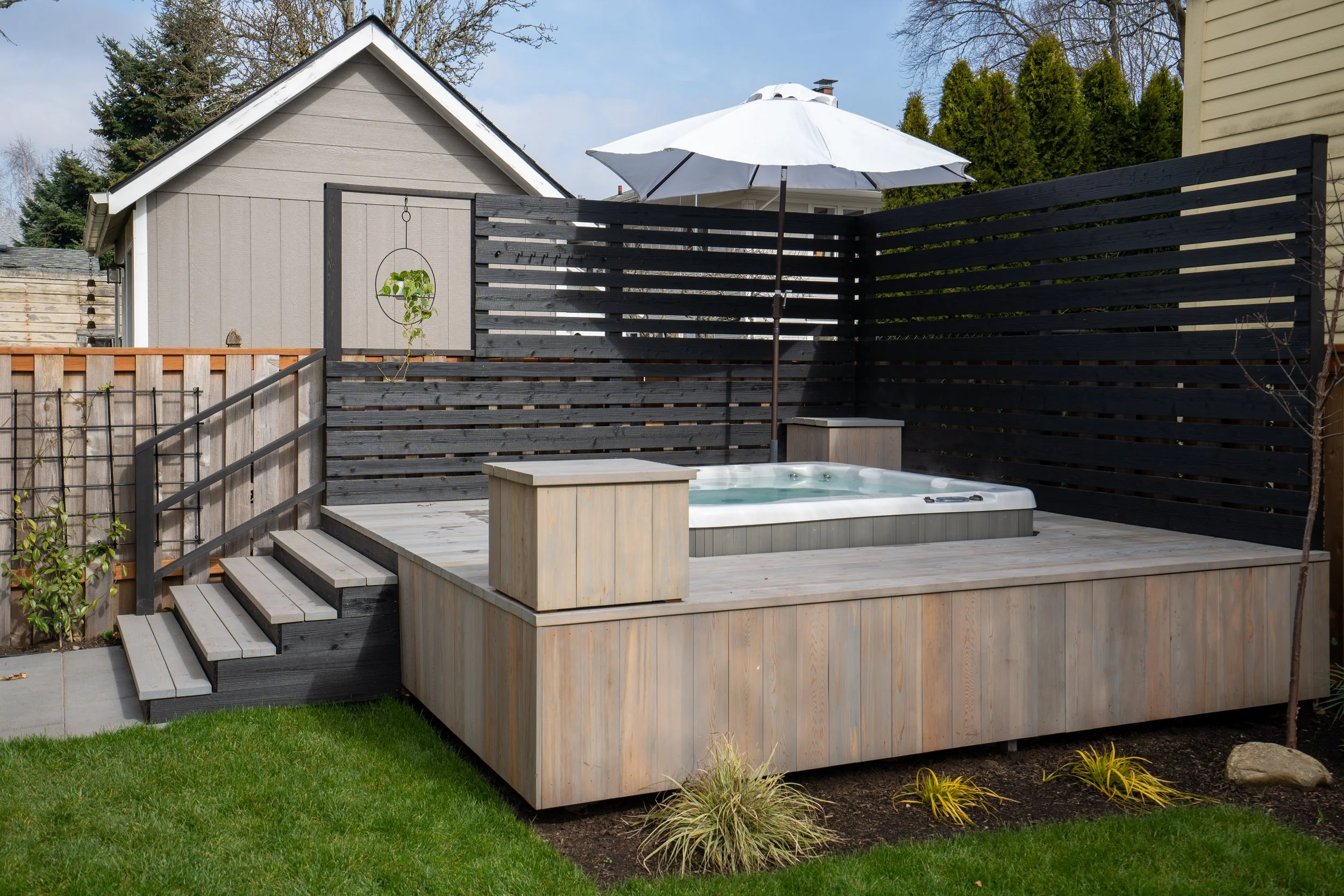The contrasting tones of soft gray wood and bold black fencing strike the perfect balance between calm and contemporary, while thoughtful details like built-in storage and an oversized umbrella ensure the space feels just as practical as it is inviting.