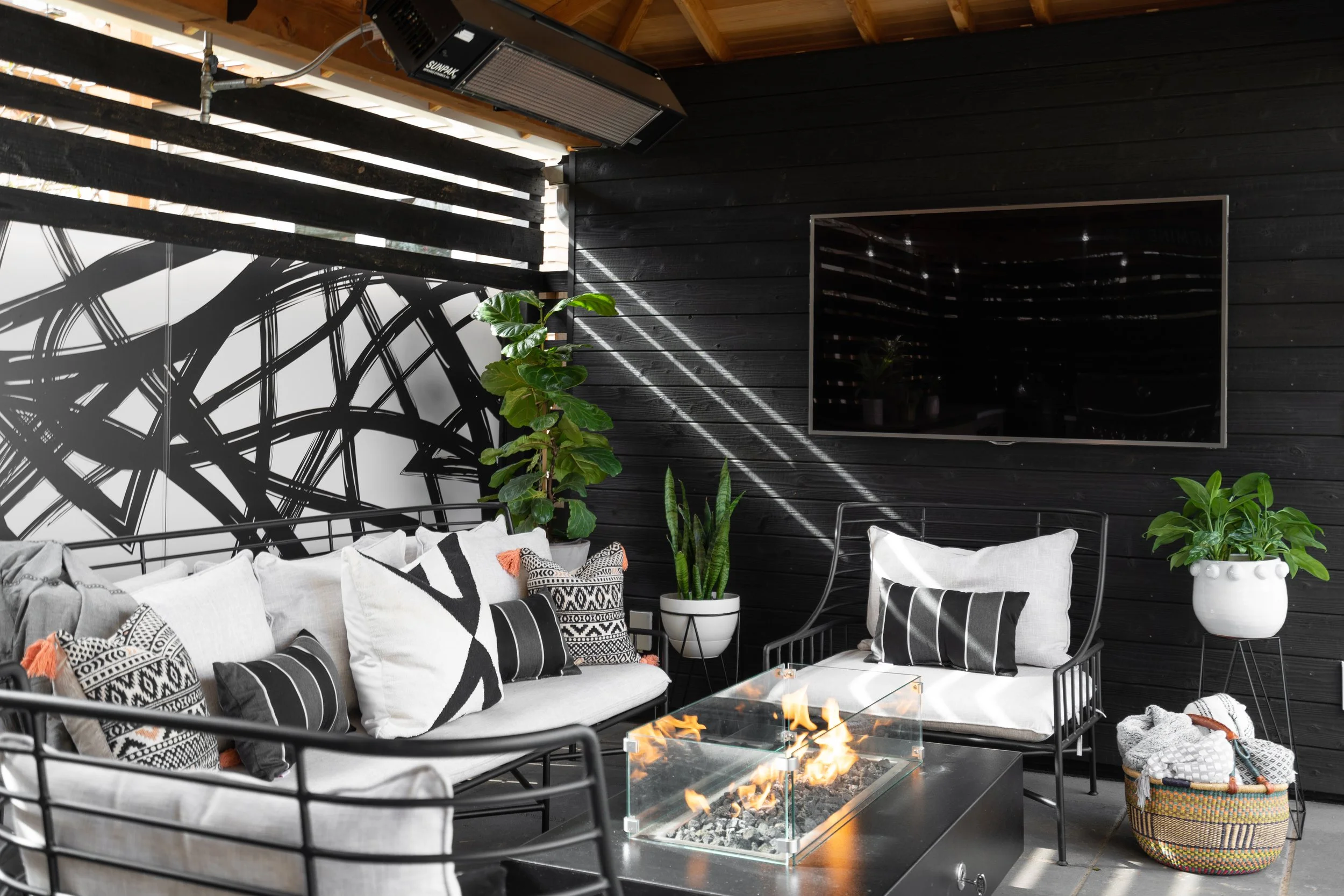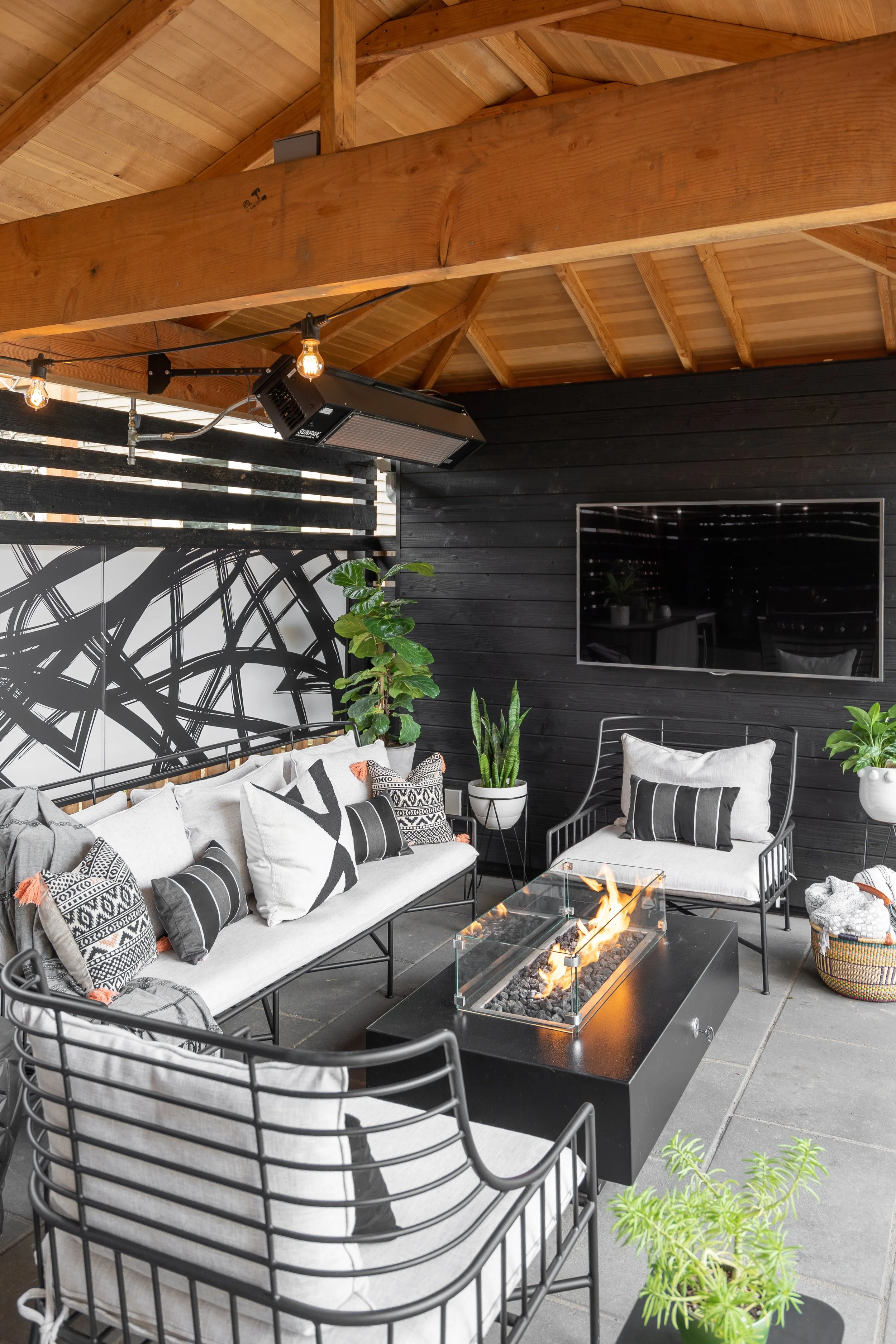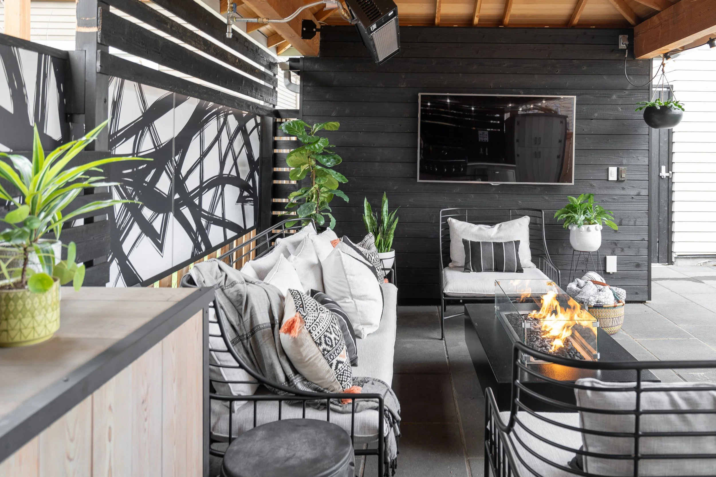 The black shiplap wall, paired with an abstract graphic mural, brings a contemporary, artistic edge, while greenery in sculptural planters softens the look and infuses the space with life. Overhead, a heater ensures year-round comfort, and a wall-mounted television transforms the setting into the ultimate entertainment zone.