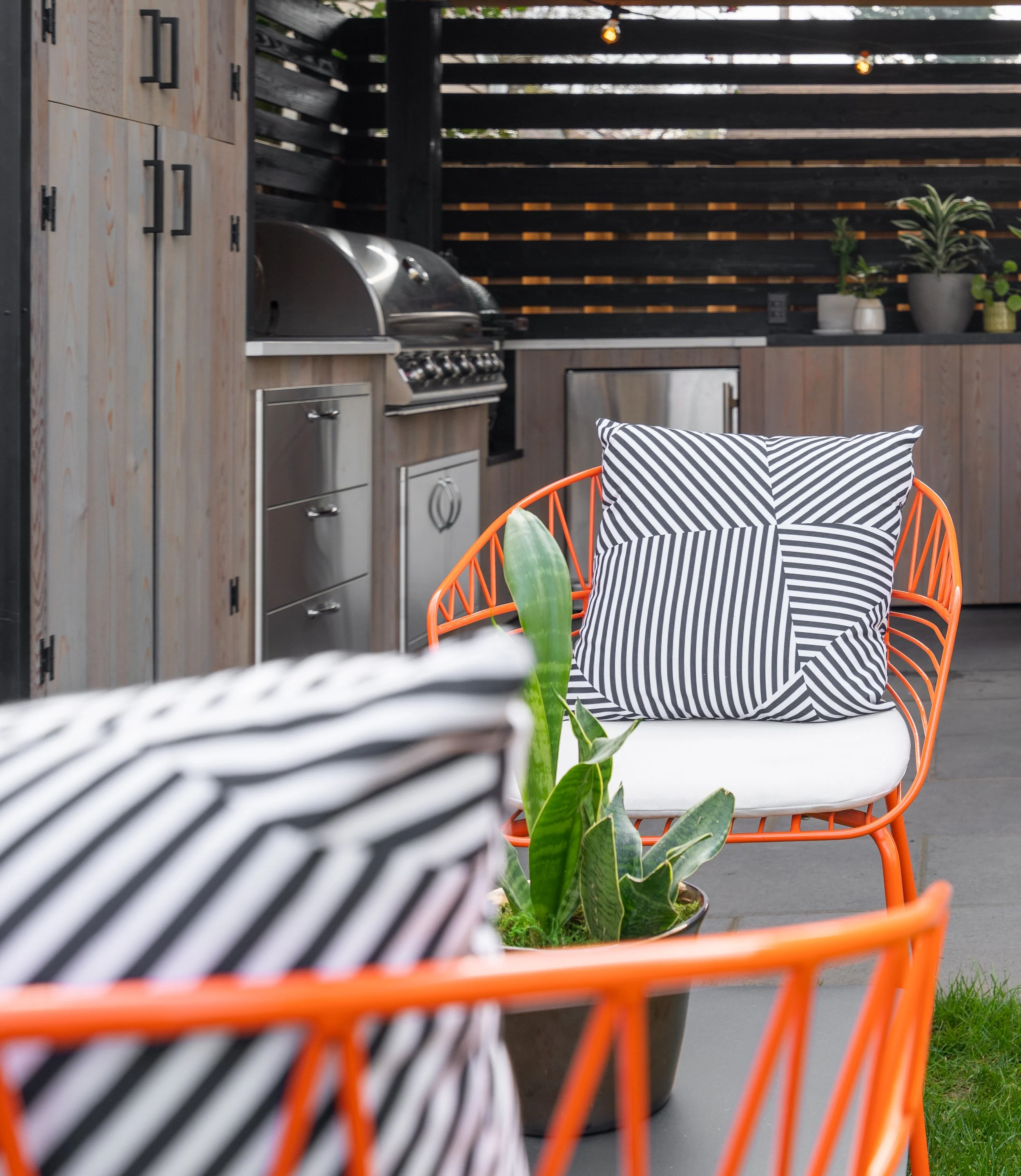 Bright orange wire-frame chairs paired with bold black-and-white patterned pillows create a happy contrast to the natural greenery. It’s a fresh, vibrant take on outdoor living that proves every space can feel welcoming even on winter days.