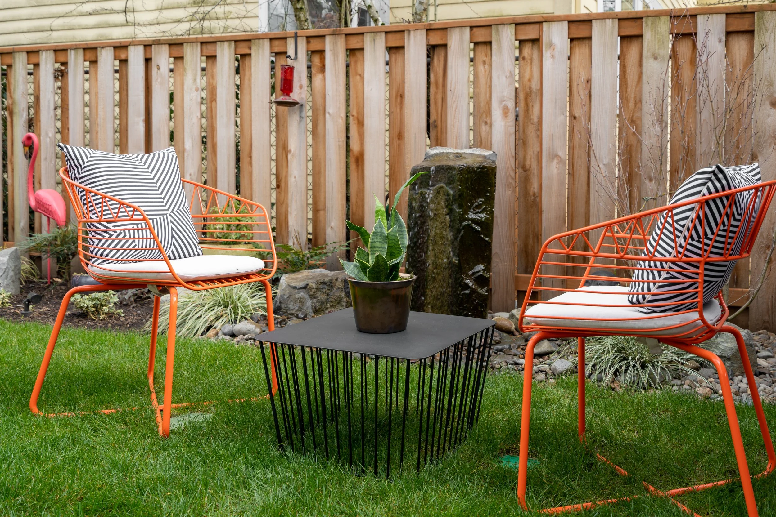 A sculptural black table anchors this fun and funky conversation space. The bright orange chairs are a lively pop of colorful perfect for those gray days. Just beyond, a water feature brings calming movement and sound, making this a relaxing spot!