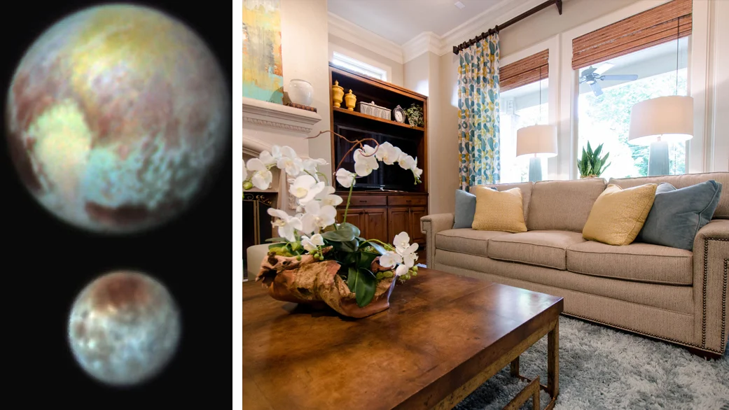 In honor of Tuesday's historic space event, I thought I would share some pictures of spaces that could have been inspired by Pluto & it's moon Charon (as seen in false color).