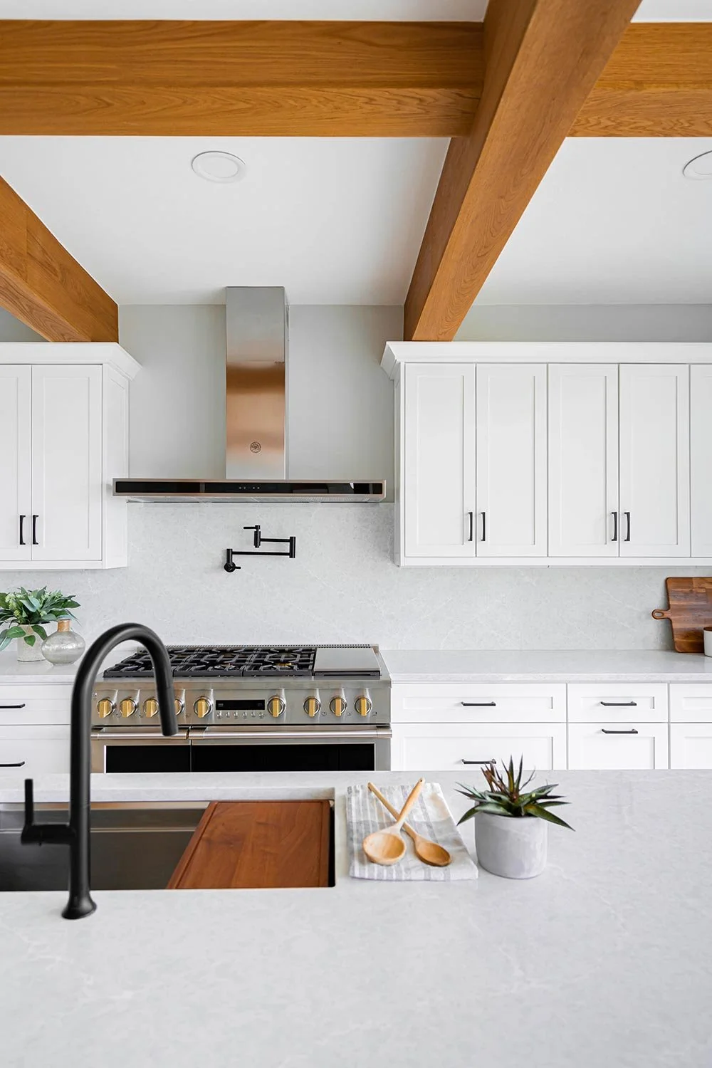 For a touch of luxury and practicality, the kitchen boasts quartz countertops that seamlessly extend to become the backsplash. The sleek and durable surface not only serves as a functional workspace but also adds a touch of sophistication to the traditional chalet style. The quartz countertops provide a smooth and easy-to-maintain surface, combining aesthetics with practicality.