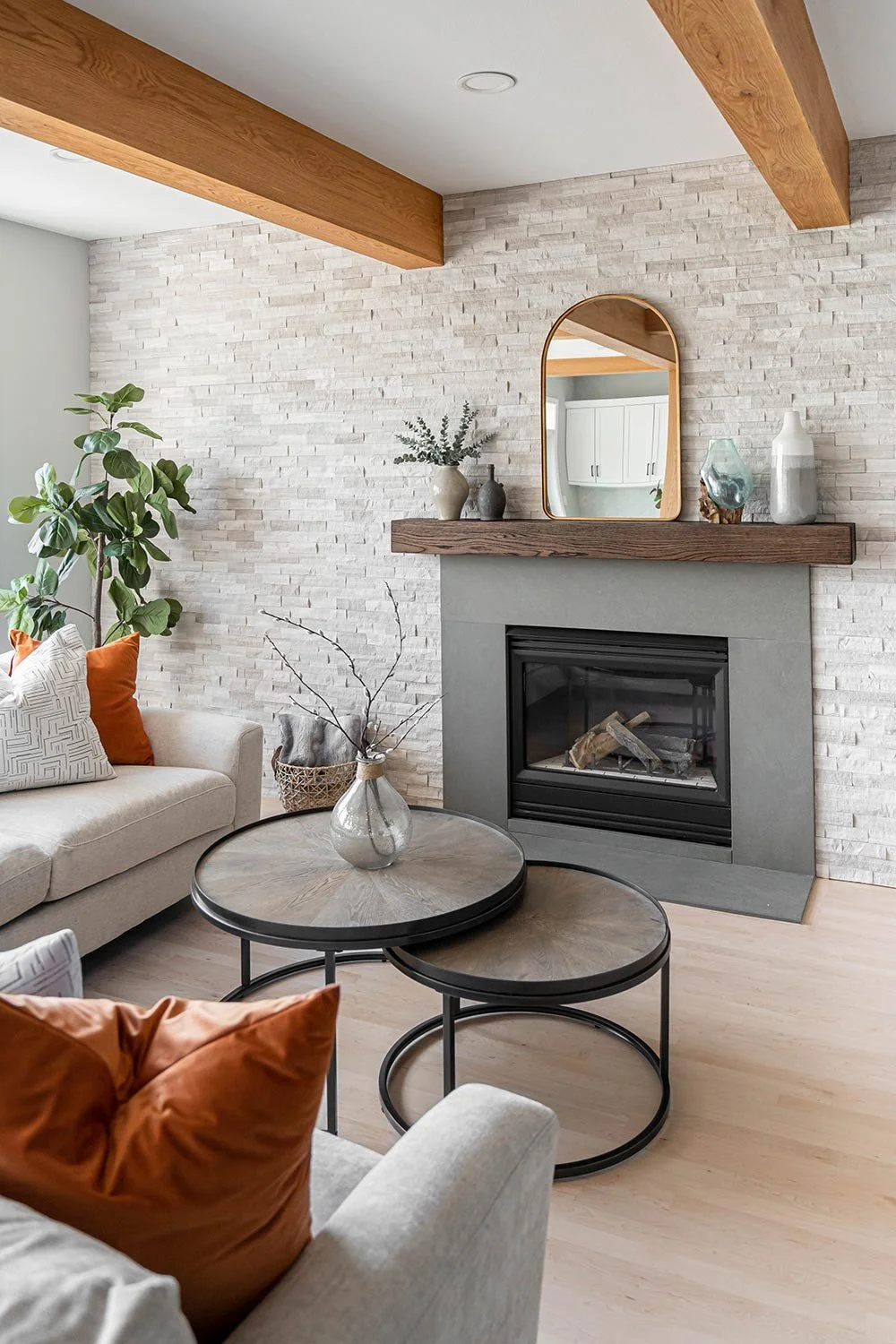 The interplay between the sturdy stone wall, the contemporary concrete fireplace, and the reclaimed mantle adds layers of interest and complexity to the overall design. It's a story of contrasts and harmonies, where different textures and materials come together to create a living space that feels both curated and lived-in. The result is a seamless transition from the charming warmth of the kitchen to the inviting comfort of the living area, offering a cohesive and aesthetically pleasing environment that celebrates the best of both worlds.